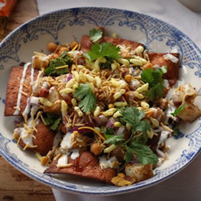 Fried shards of pastry with a spicy potato topping, smothered with natural set yogurt and tamarind sauce and garnished with…