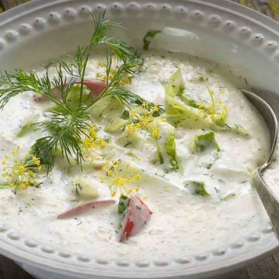 A wonderful recipe of soft potato cubes, juliennes of fresh locally sourced cucumber and onion in a natural set yogurt.