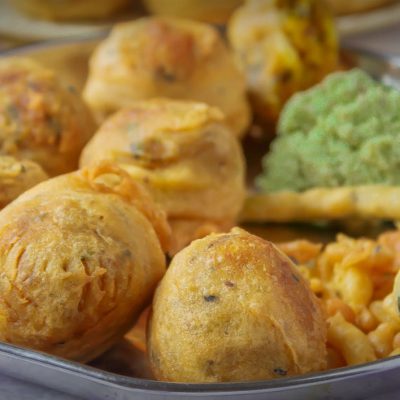 A thickly creamed locally sourced potato which is then coated with chickpea flour before being deep-fried then served with tamarind…