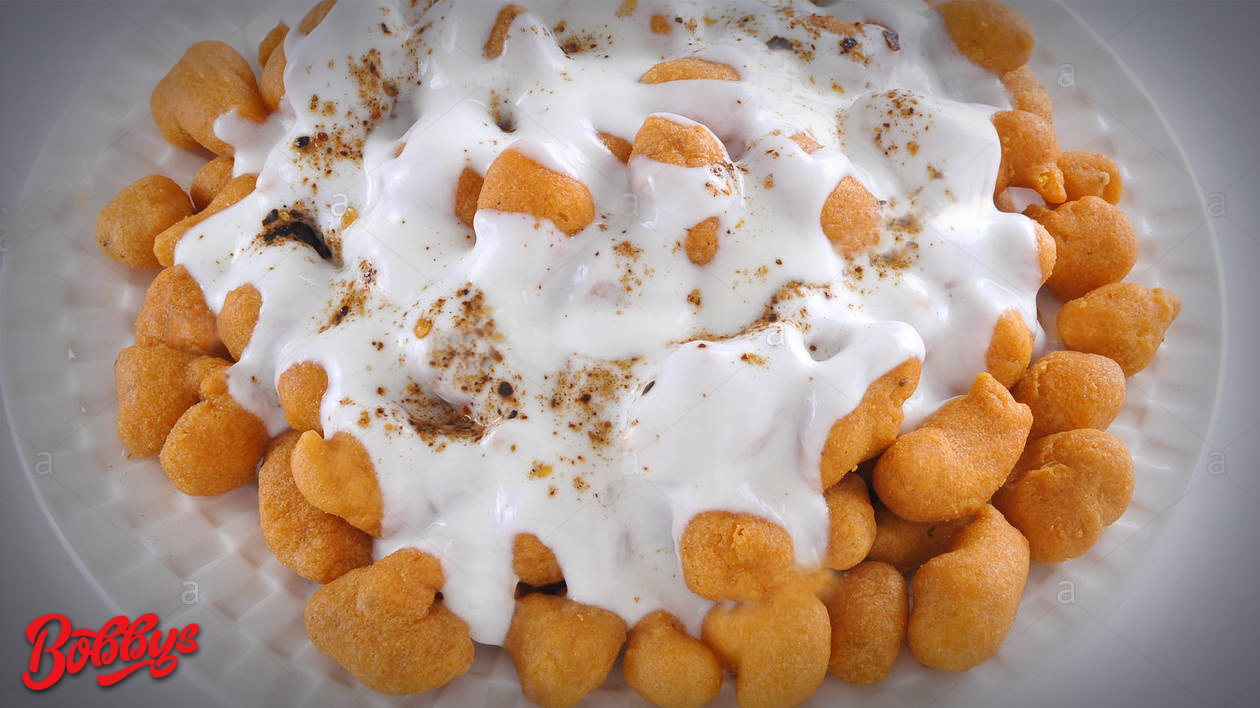 Dahi Bhoondi is a delicious mixture of fried chickpea balls in a rich and creamy 100% natural set yoghurt. Excellent.