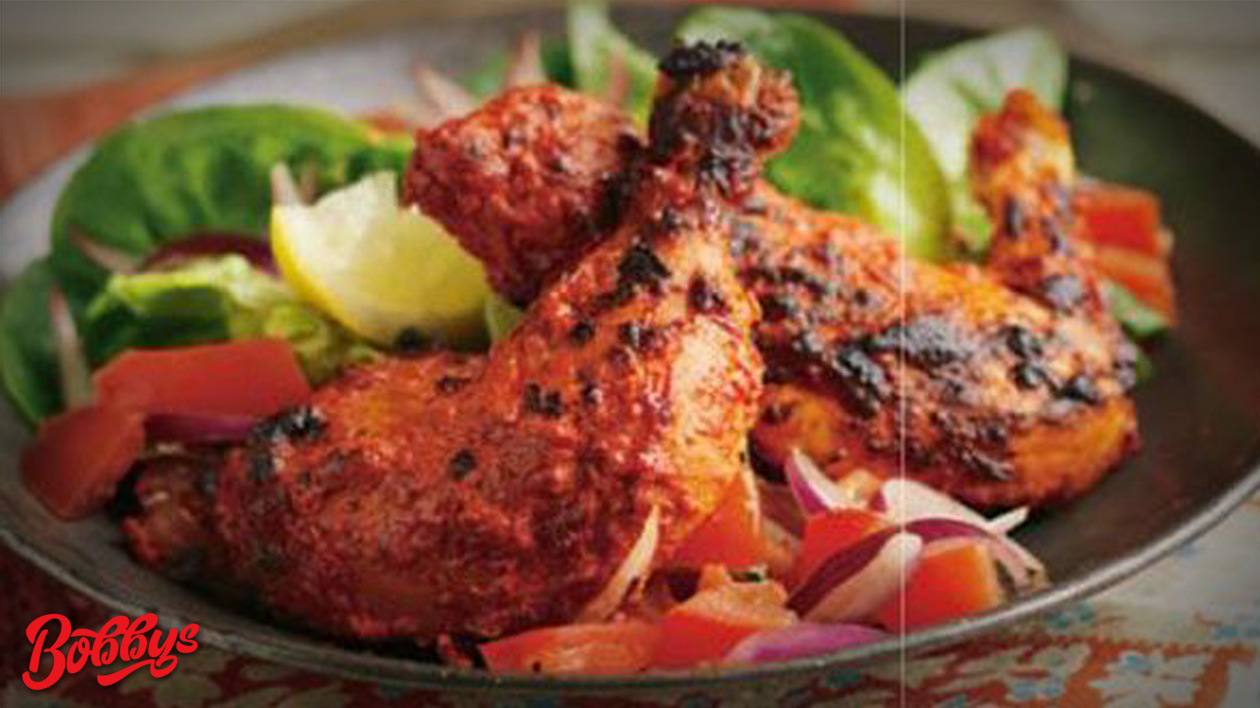 Freshly cooked Tandoori chicken legs, marinated with traditional Indian herbs and spices then garnished with coriander.